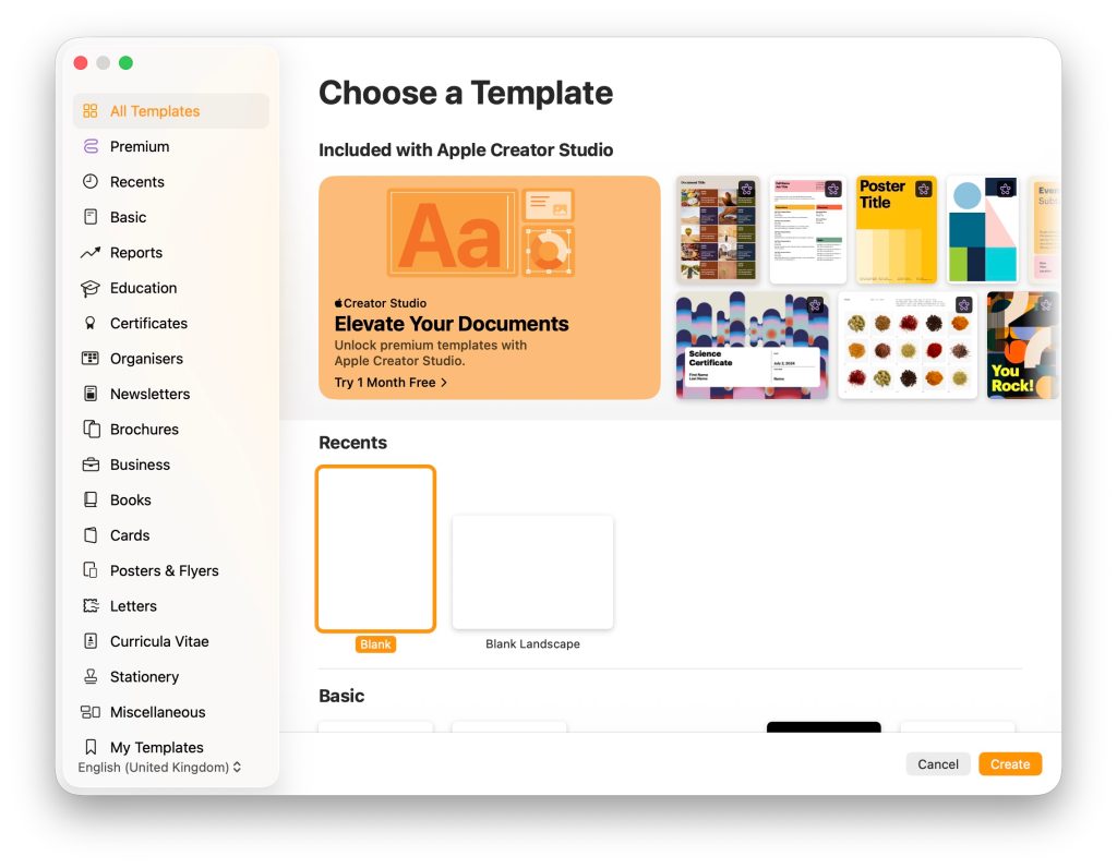 Hay varias razones por las que podría optar por seguir utilizando los originales en lugar de las versiones ACS. La primera es una invitación algo intrusiva a suscribirse. Cuando crea un nuevo documento de Pages, por ejemplo, verá esta como la opción más destacada frente a las plantillas integradas.