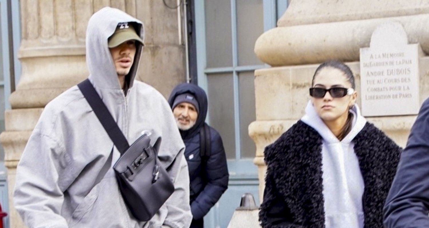 El modelo y exfutbolista de 23 años salió de la estación de tren con su novia Kim Turnbull Vino a París, Francia, para Semana de la moda el jueves 22 de enero.