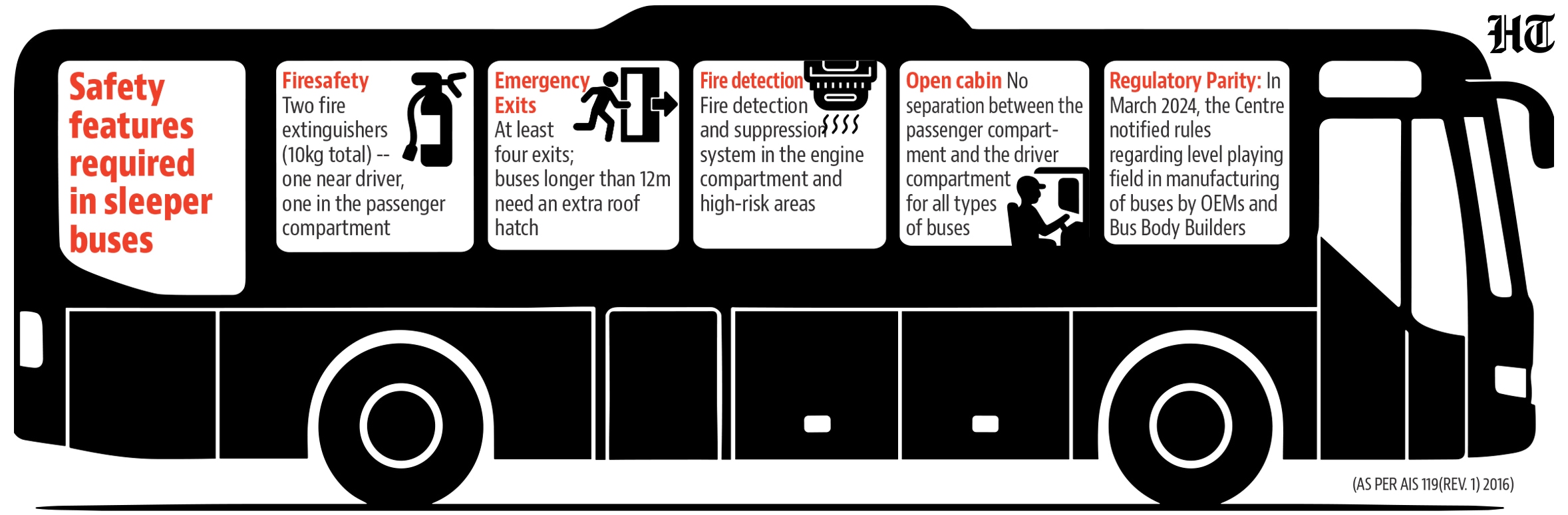 En la India, los estándares de la industria automotriz como AIS-052 (código de carrocería de autobús), AIS-119 (código de autobús cama) y AIS-134 (sistema de detección y extinción de incendios) especifican requisitos para la construcción y la seguridad contra incendios.