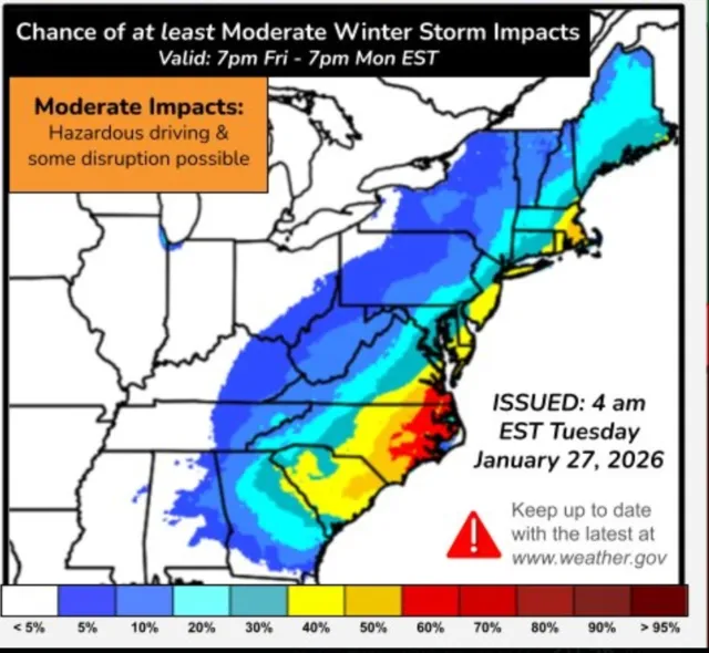 Un nuevo mapa de pronóstico compartido por el Centro Nacional de Predicción Meteorológica (NWS) muestra que hay entre un 60 y un 70 por ciento de posibilidades de que se sientan impactos al menos moderados en Carolina del Norte y Virginia este fin de semana. Se espera una menor probabilidad de un impacto más generalizado desde el sur de Georgia hacia el norte hasta Maine.